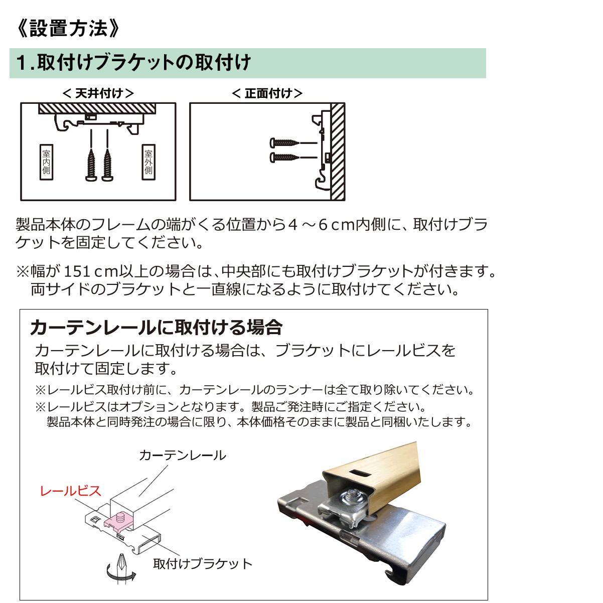 ロールスクリーン本体の向きを変えることで、天井付け、正面付け(横付け)ができます。商品付属のカーテンレール設置金具がお客様のカーテンレールの規格にあえば、カーテンレール付けも可能です。