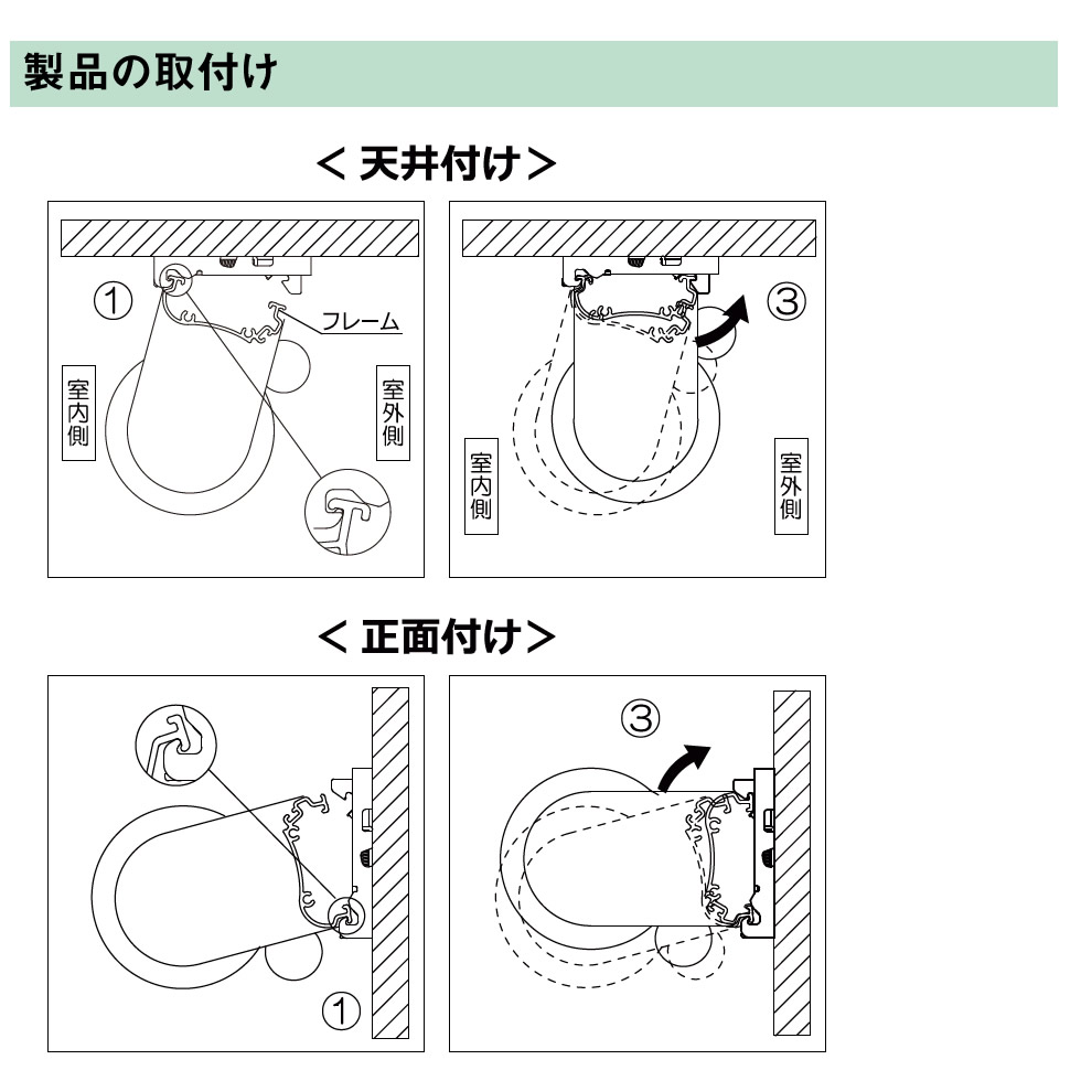 ロールスクリーン本体の向きを変えることで、天井付け、正面付け(横付け)ができます。商品付属のカーテンレール設置金具がお客様のカーテンレールの規格にあえば、カーテンレール付けも可能です。